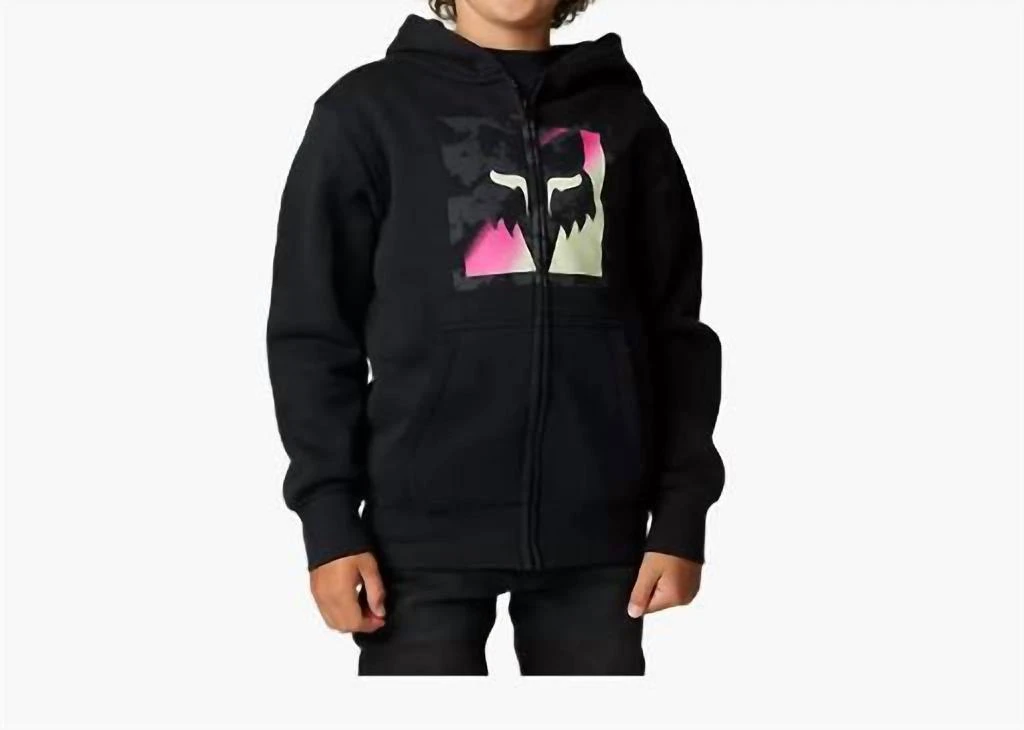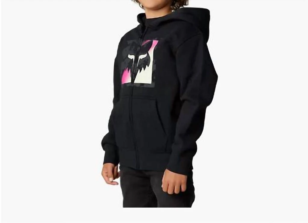 s Detonate Zip Hoodie by Fox Racing, a stylish choice for young fox fans who want to keep warm. This hoodie is crafted from a soft 80% cotton and 20% polyester fleece, offering comfort and warmth with its brushed interior. It